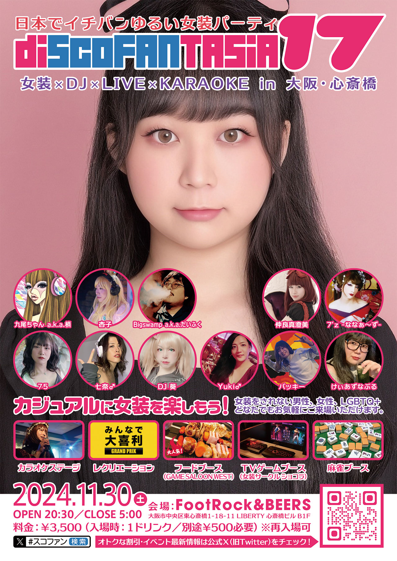 大阪のシャレオツな街『心斎橋』へ 日本全国から女装さん、MtFさん、NHさんが大集合! 楽しいレクリエーションがいっぱい。 • 日時 2024年11月30日(土) OPEN 20:30 / CLOSE 29:00(翌 5:00) • 入場チケット ¥3,500-(別途ドリンク代¥500-) • 会場 FootRock&BEERS 大阪府大阪市中央区東心斎橋1-18-11 LIBERTY 心斎橋ビル B1 ※女装さん限定のパーティではありませんので、20歳以上の方でしたら、どなたでもご参加いただけます。 ※新型コロナ感染対策として、光触媒 除菌・脱臭デバイス『ターンド・ケイ』を導入しています。 • disco FANTASiA とは? 全世界の女装さんと女装さんを応援する人たちのためのMIXパーティ! 女装をされない男性、女性の方もお楽しみいただけるオープンなイベントです。 カジュアル女装さんも、コスプレ女装さんも、セクシー女装さんも、MtFさんも、ニューハーフさんも、男性も、女性も、ゲイさんも、ビアンさんも、バイセクシャルさんも、性別迷子さんも、ノンケさんも、宇宙人さんも、女装に理解のある方でしたら、みんな大歓迎です♪ どんな方でも楽しめるよう、スタッフ一同、心がけております。