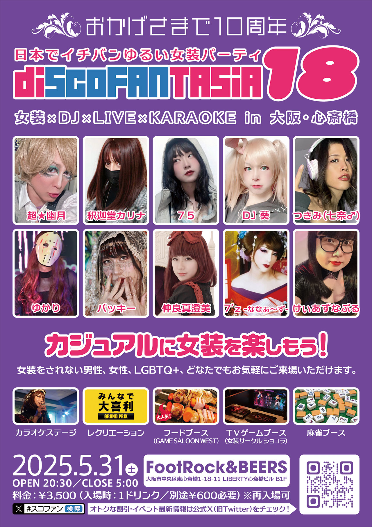 ~おかげさまで10周年~ 大阪のシャレオツな街『心斎橋』へ 日本全国から女装さん、MtFさん、NHさんが大集合! 楽しいレクリエーションがいっぱい。 • 日時 2025年5月31日(土) OPEN 20:30 / CLOSE 29:00(翌 5:00) • 入場チケット ¥3,500-(別途ドリンク代¥600-) • 会場 FootRock&BEERS 大阪府大阪市中央区東心斎橋1-18-11 LIBERTY 心斎橋ビル B1 ※女装さん限定のパーティではありませんので、20歳以上の方でしたら、どなたでもご参加いただけます。 ※新型コロナ感染対策として、光触媒 除菌・脱臭デバイス『ターンド・ケイ』を導入しています。 • disco FANTASiA とは? 全世界の女装さんと女装さんを応援する人たちのためのMIXパーティ! 女装をされない男性、女性の方もお楽しみいただけるオープンなイベントです。 カジュアル女装さんも、コスプレ女装さんも、セクシー女装さんも、MtFさんも、ニューハーフさんも、男性も、女性も、ゲイさんも、ビアンさんも、バイセクシャルさんも、性別迷子さんも、ノンケさんも、宇宙人さんも、女装に理解のある方でしたら、みんな大歓迎です♪ どんな方でも楽しめるよう、スタッフ一同、心がけております。