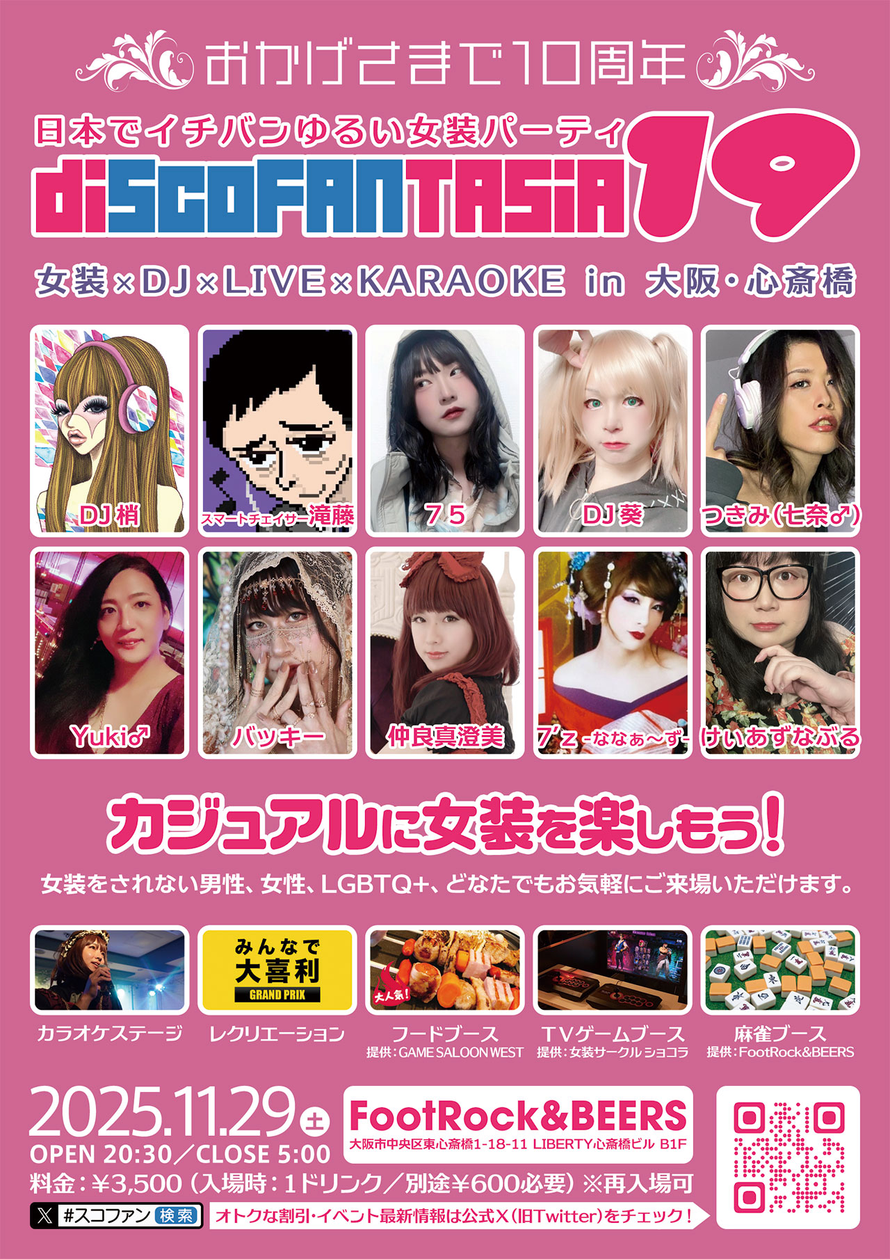 ~おかげさまで10周年~ 大阪のシャレオツな街『心斎橋』へ 日本全国から女装さん、MtFさん、NHさんが大集合! 楽しいレクリエーションがいっぱい。 • 日時 2025年11月29日(土) OPEN 20:30 / CLOSE 29:00(翌 5:00) • 入場チケット ¥3,500-(別途ドリンク代¥600-) • 会場 FootRock&BEERS 大阪府大阪市中央区東心斎橋1-18-11 LIBERTY 心斎橋ビル B1 ※女装さん限定のパーティではありませんので、20歳以上の方でしたら、どなたでもご参加いただけます。 ※新型コロナ感染対策として、光触媒 除菌・脱臭デバイス『ターンド・ケイ』を導入しています。 • disco FANTASiA とは? 全世界の女装さんと女装さんを応援する人たちのためのMIXパーティ! 女装をされない男性、女性の方もお楽しみいただけるオープンなイベントです。 カジュアル女装さんも、コスプレ女装さんも、セクシー女装さんも、MtFさんも、ニューハーフさんも、男性も、女性も、ゲイさんも、ビアンさんも、バイセクシャルさんも、性別迷子さんも、ノンケさんも、宇宙人さんも、女装に理解のある方でしたら、みんな大歓迎です♪ どんな方でも楽しめるよう、スタッフ一同、心がけております。