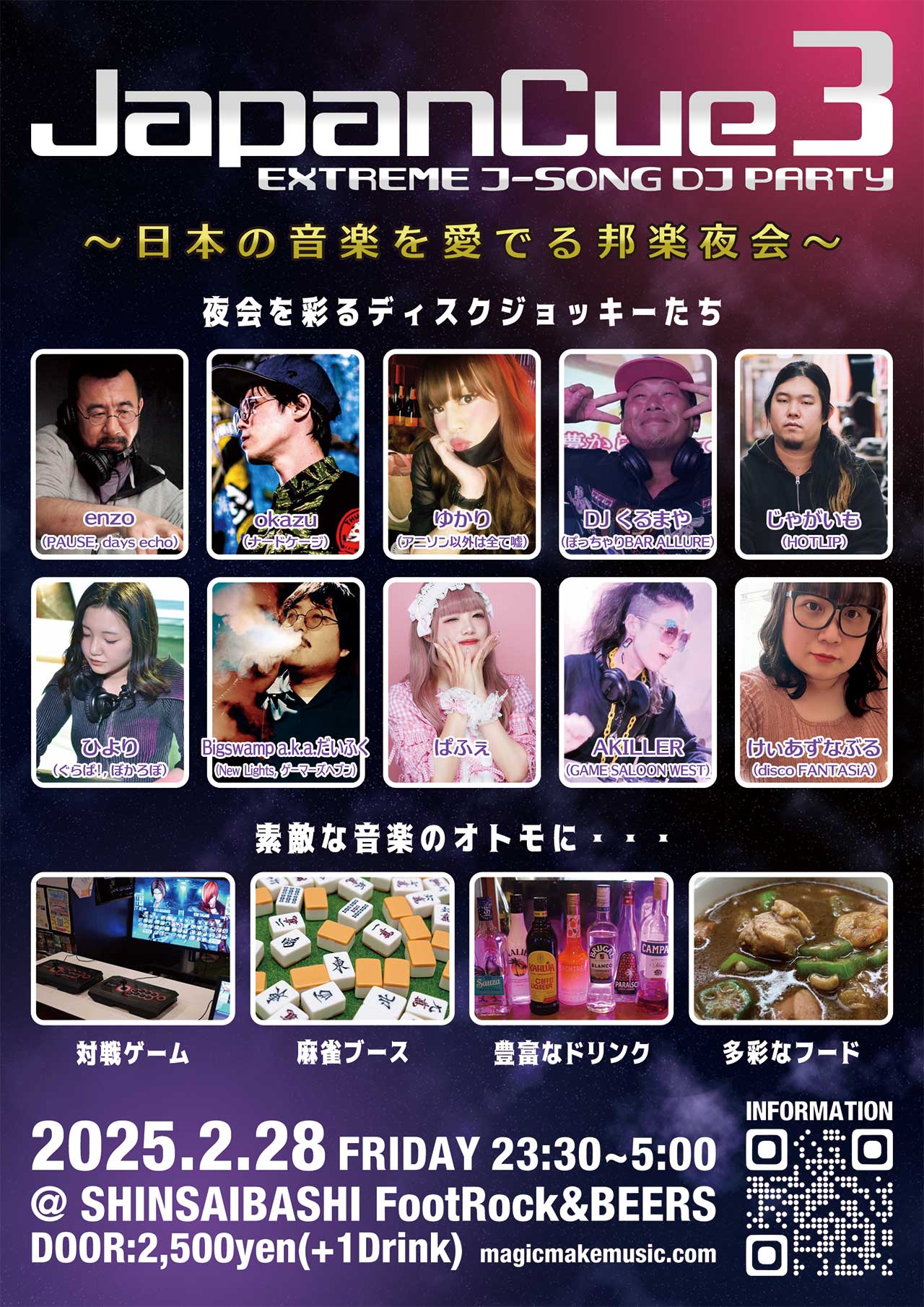 けぃあずなぶる主催! 日本の音楽を愛するものたちが集う エクストリームな邦楽パーティ • 日時 2025年2月28日(金) OPEN 23:30 / CLOSE 29:00(翌 5:00) • 入場チケット ¥2,500-(別途ドリンク代¥500-) • 会場 FootRock&BEERS 大阪府大阪市中央区東心斎橋1-18-11 LIBERTY 心斎橋ビル B1 ※新型コロナ感染対策として、光触媒 除菌・脱臭デバイス『ターンド・ケイ』を導入しています。 • JapanCue とは? ![]()