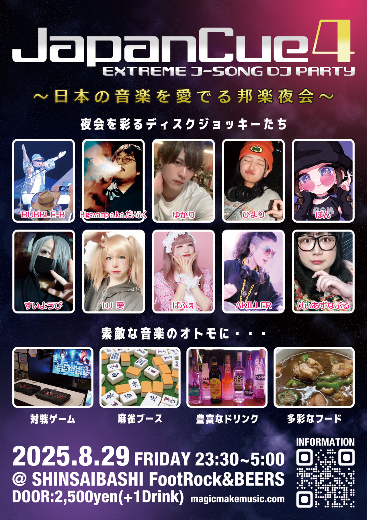 けぃあずなぶる主催! 日本の音楽を愛するものたちが集う エクストリームな邦楽パーティ • 日時 2025年8月29日(金) OPEN 23:30 / CLOSE 29:00(翌 5:00) • 入場チケット ¥2,500-(別途ドリンク代¥600-) • 会場 FootRock&BEERS 大阪府大阪市中央区東心斎橋1-18-11 LIBERTY 心斎橋ビル B1 ※新型コロナ感染対策として、光触媒 除菌・脱臭デバイス『ターンド・ケイ』を導入しています。 • JapanCue とは? ![]()